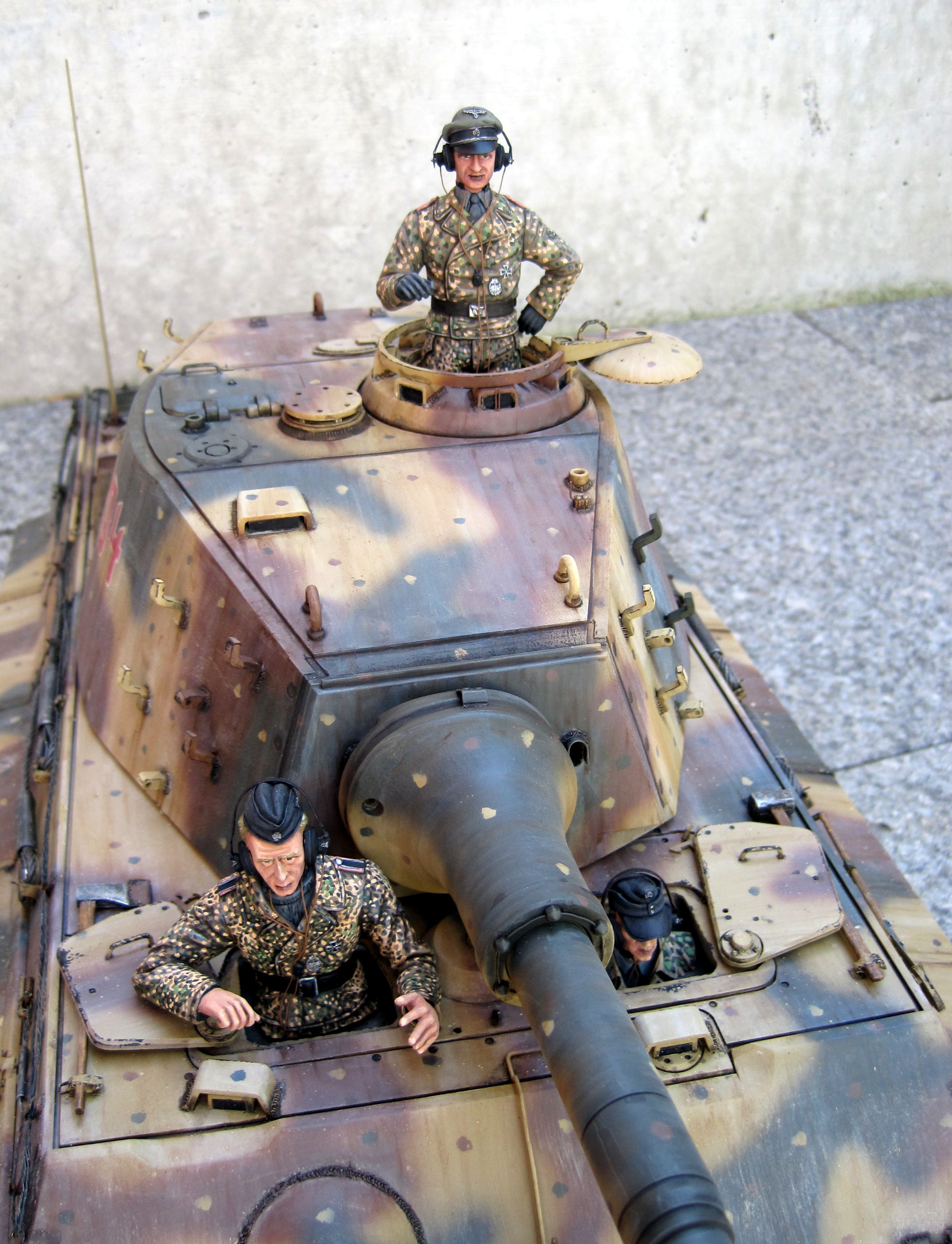 Another essential feature to me was the addition of some figures, as I think that scale models without figures look very lifeless, and that nice figures add a lot to the overall finish of a model. Therefore I bought some resin figures from Verlinden productions, that were assemblied and painted after the recompletion of the tank.
