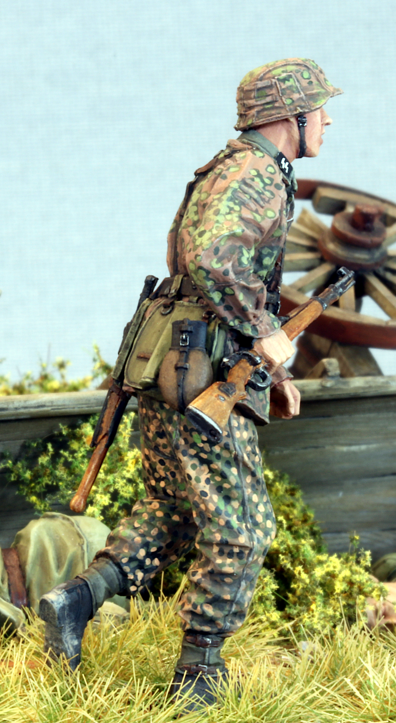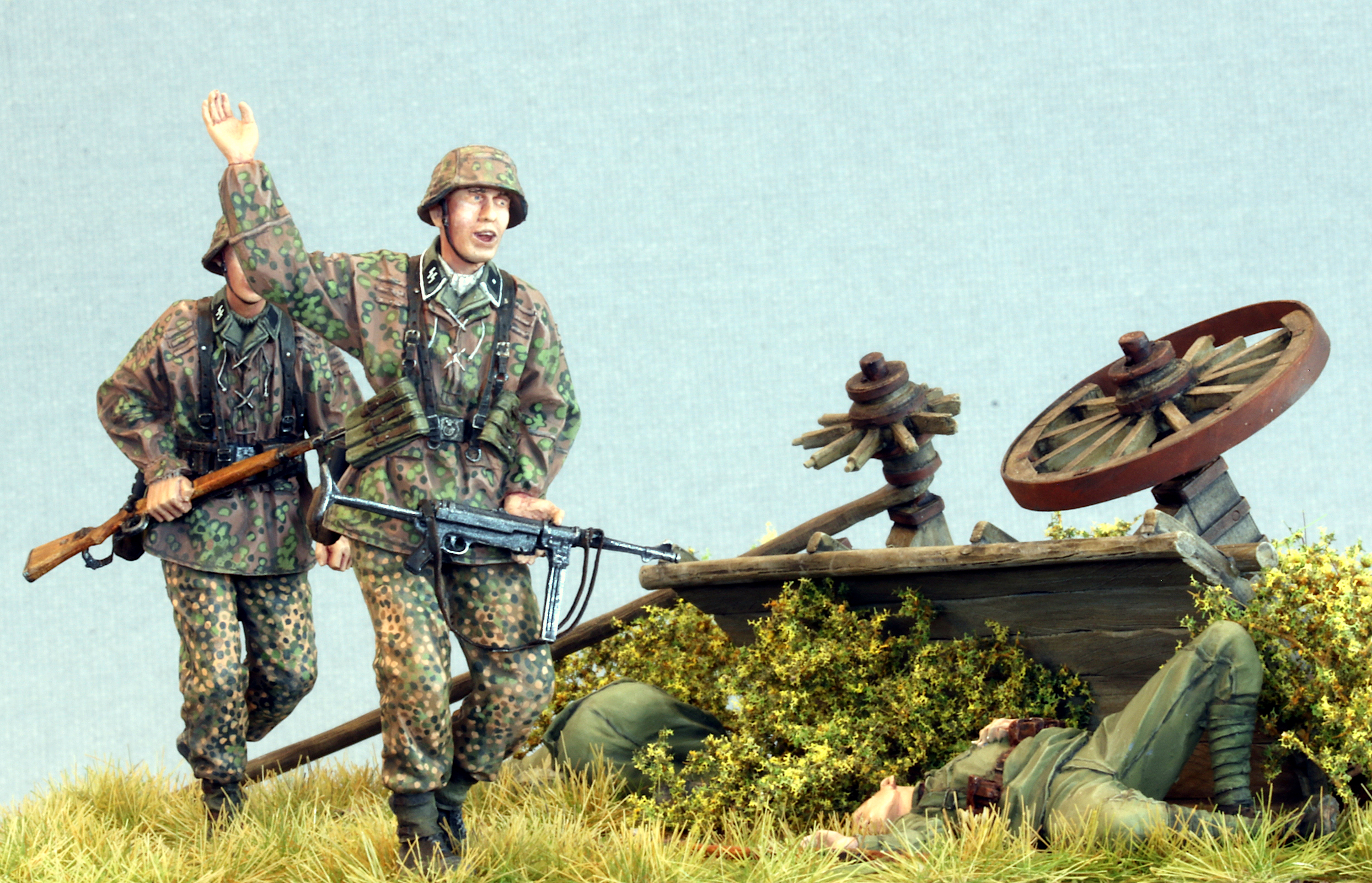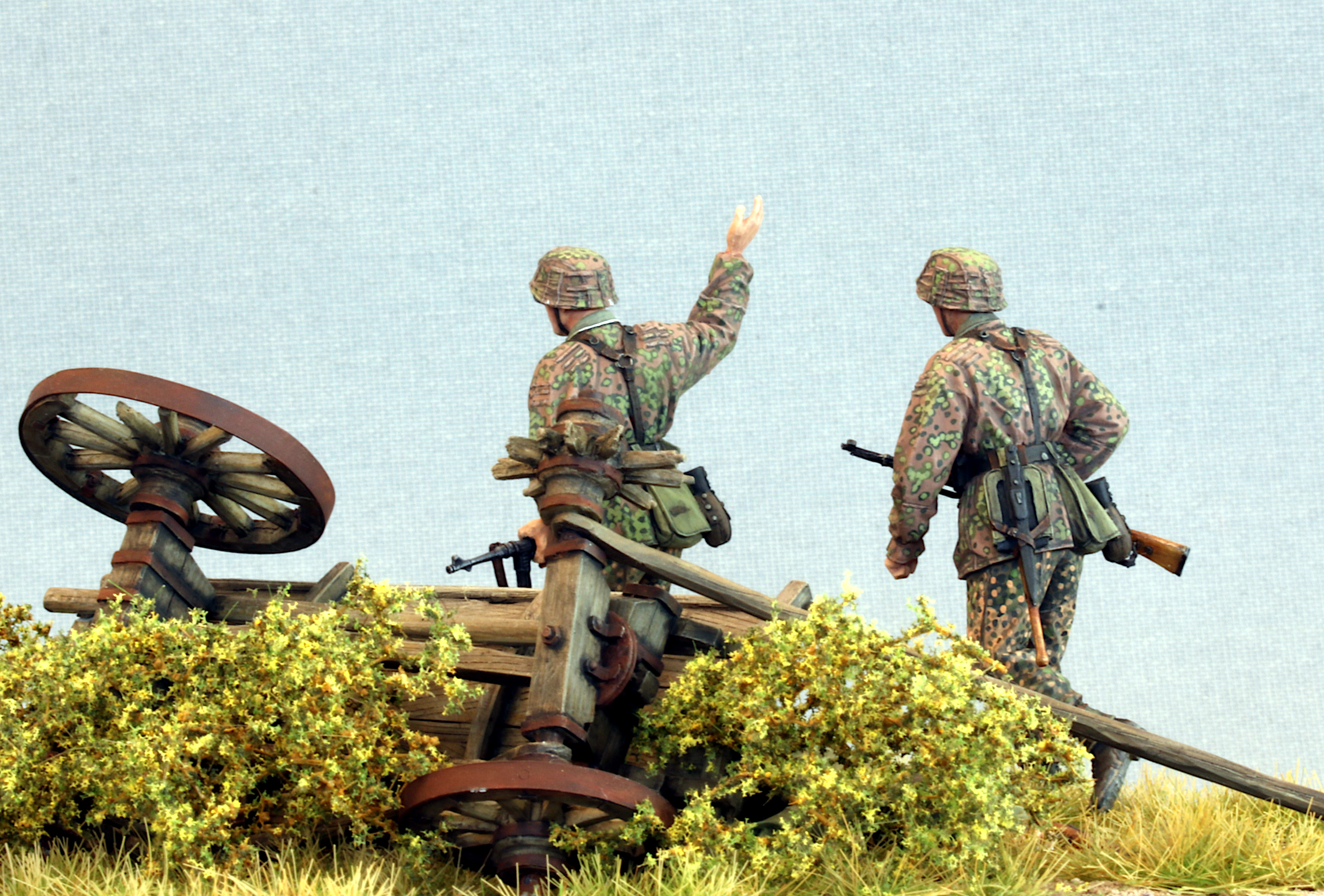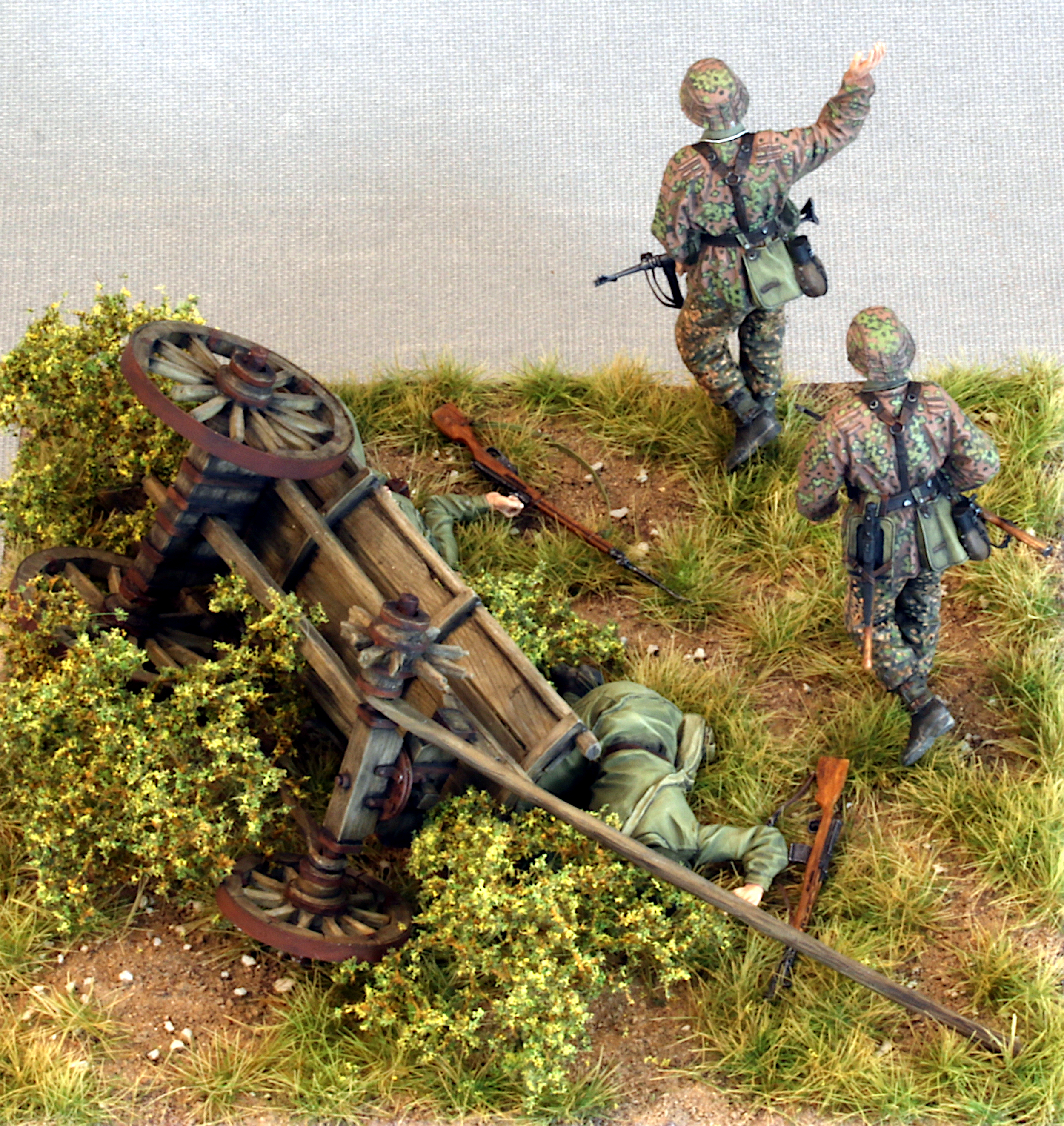 I now finally made use of the cart, adding two dead Soviet soldiers from a Stalingrad figure set, as well as two WSS Grenadiers from Alpine.