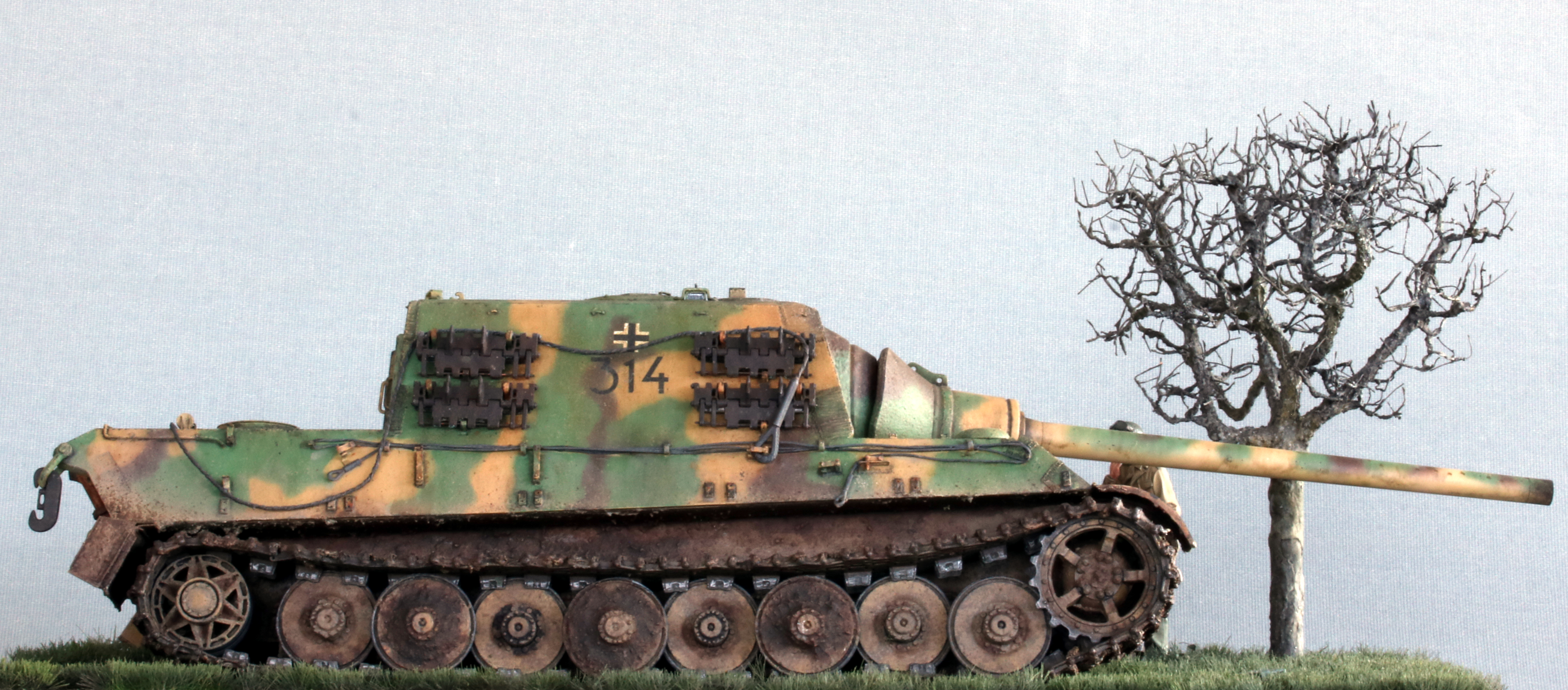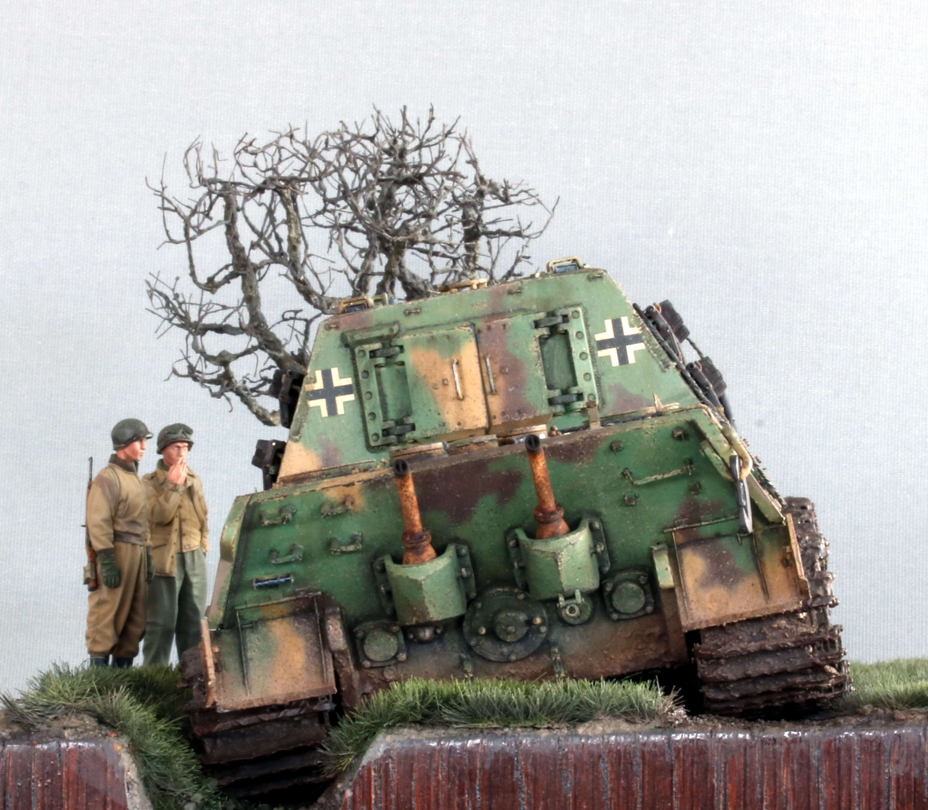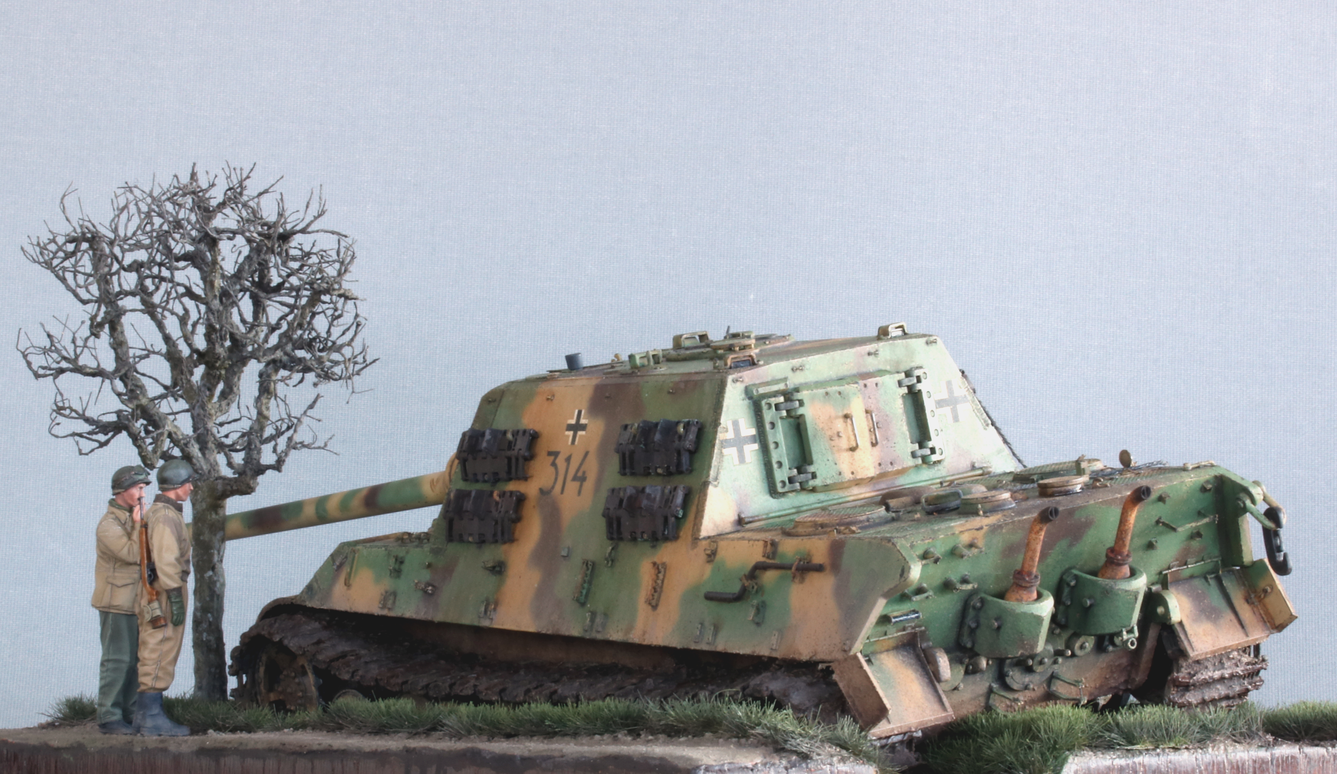 The next tank hunter I have finished is the ultimate heavy weight, the Jagdtiger. A small number of those had a Porsche design suspension (all other a Henschel drive like the Tiger II tank), and I like the look of it. So I decided to build one of those vehicles, also featuring Zimmerit. The vehicle is tank number 314, which belonged to the heavy tank hunter unit 653, and was originally abandoned on March 17, 1945, near Strassbourg. I also depicted an abandoned vehicle, inspected by American soldiers, but in a slightly different setting.