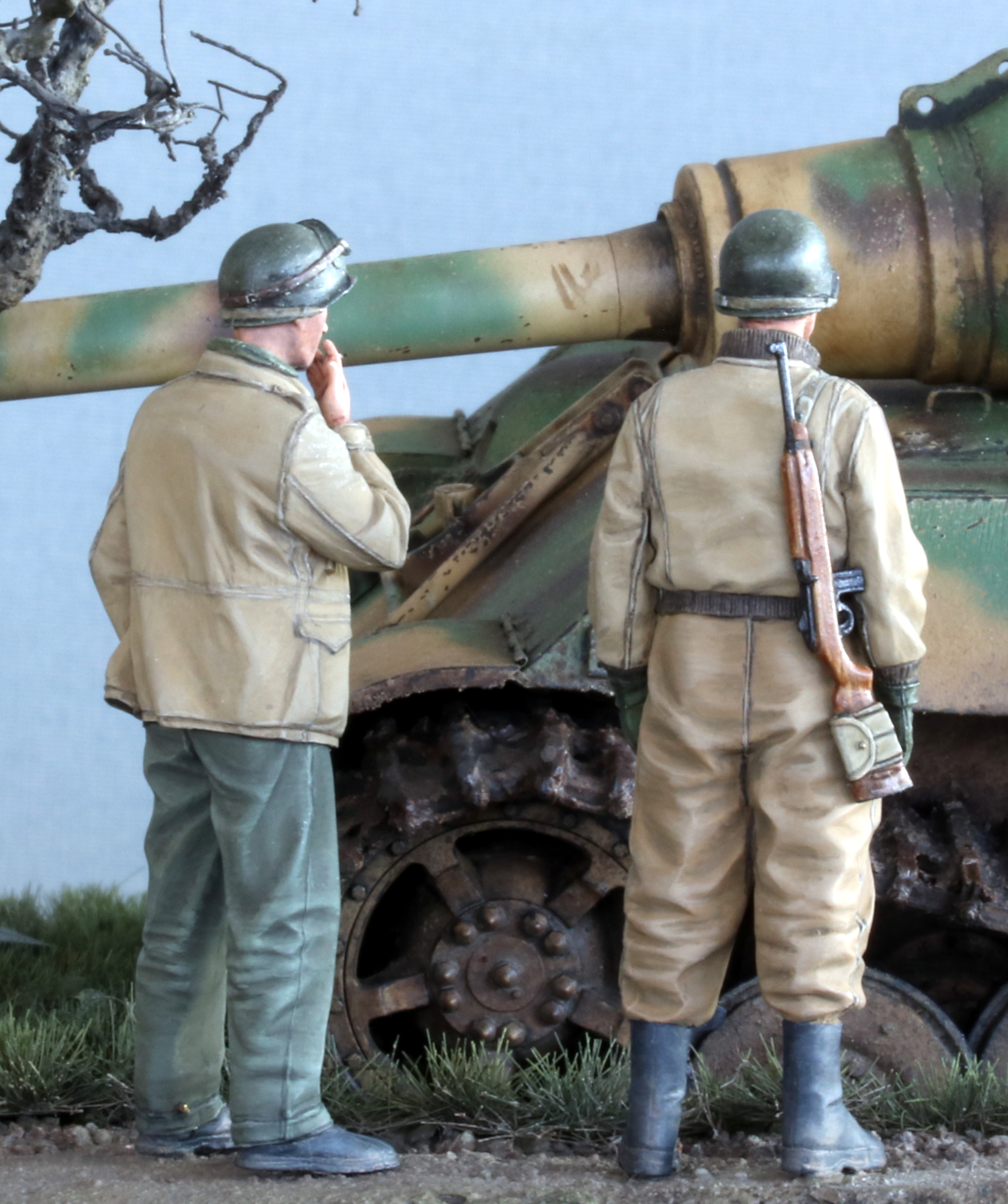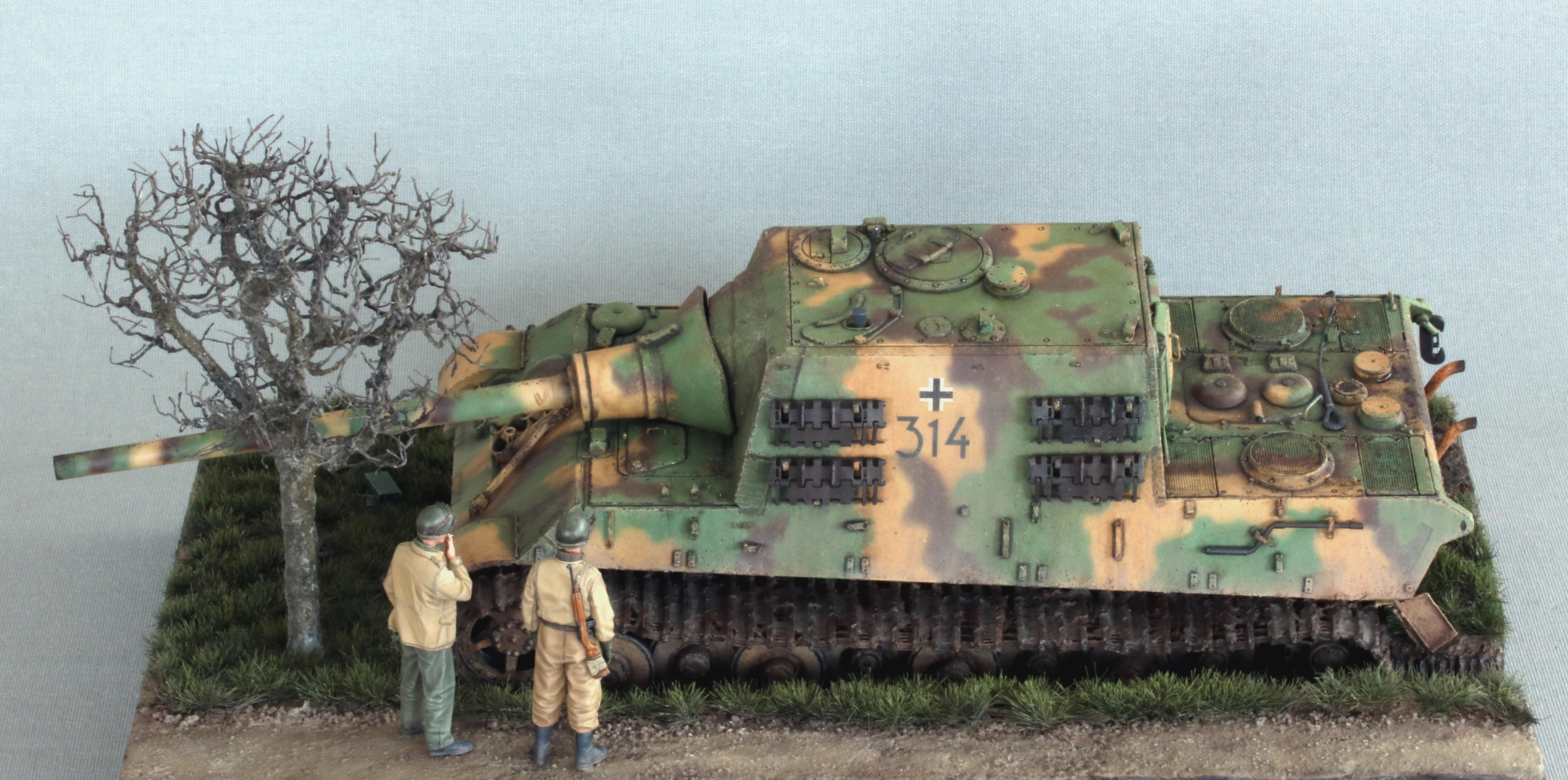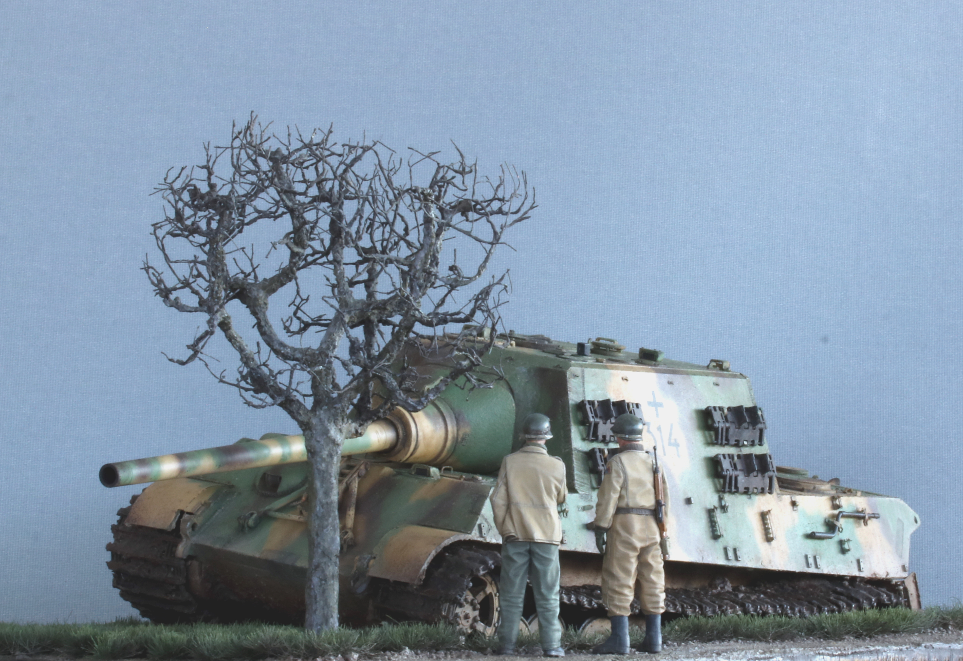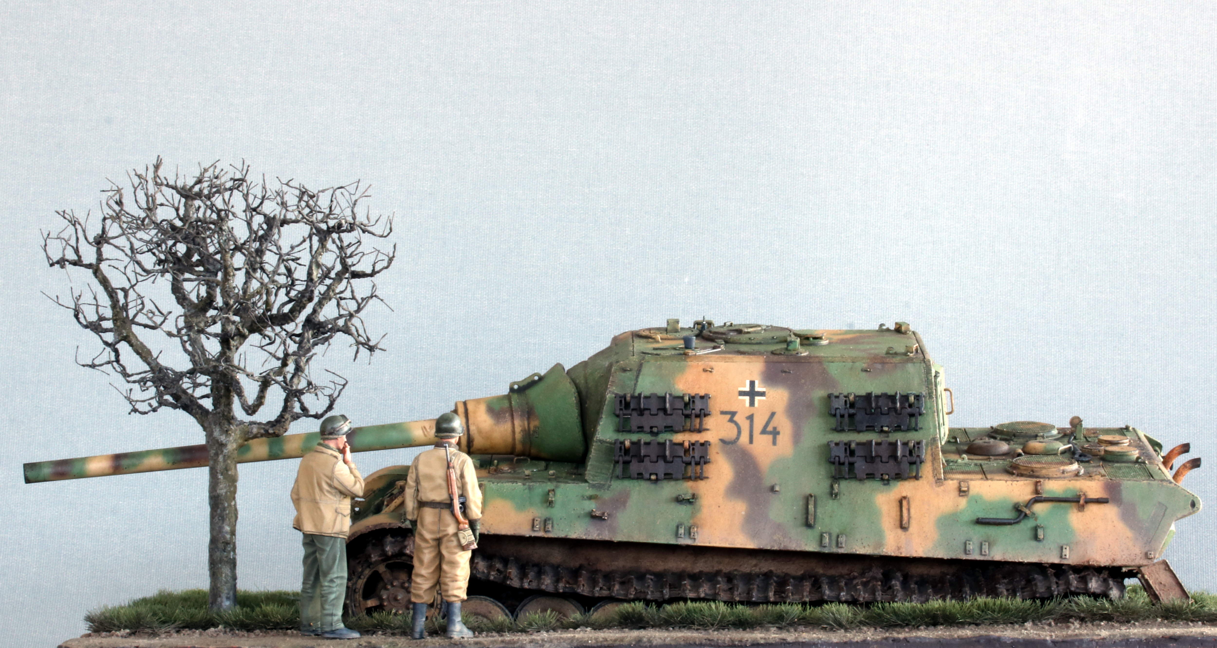 The next tank hunter I have finished is the ultimate heavy weight, the Jagdtiger. A small number of those had a Porsche design suspension (all other a Henschel drive like the Tiger II tank), and I like the look of it. So I decided to build one of those vehicles, also featuring Zimmerit. The vehicle is tank number 314, which belonged to the heavy tank hunter unit 653, and was originally abandoned on March 17, 1945, near Strassbourg. I also depicted an abandoned vehicle, inspected by American soldiers, but in a slightly different setting.