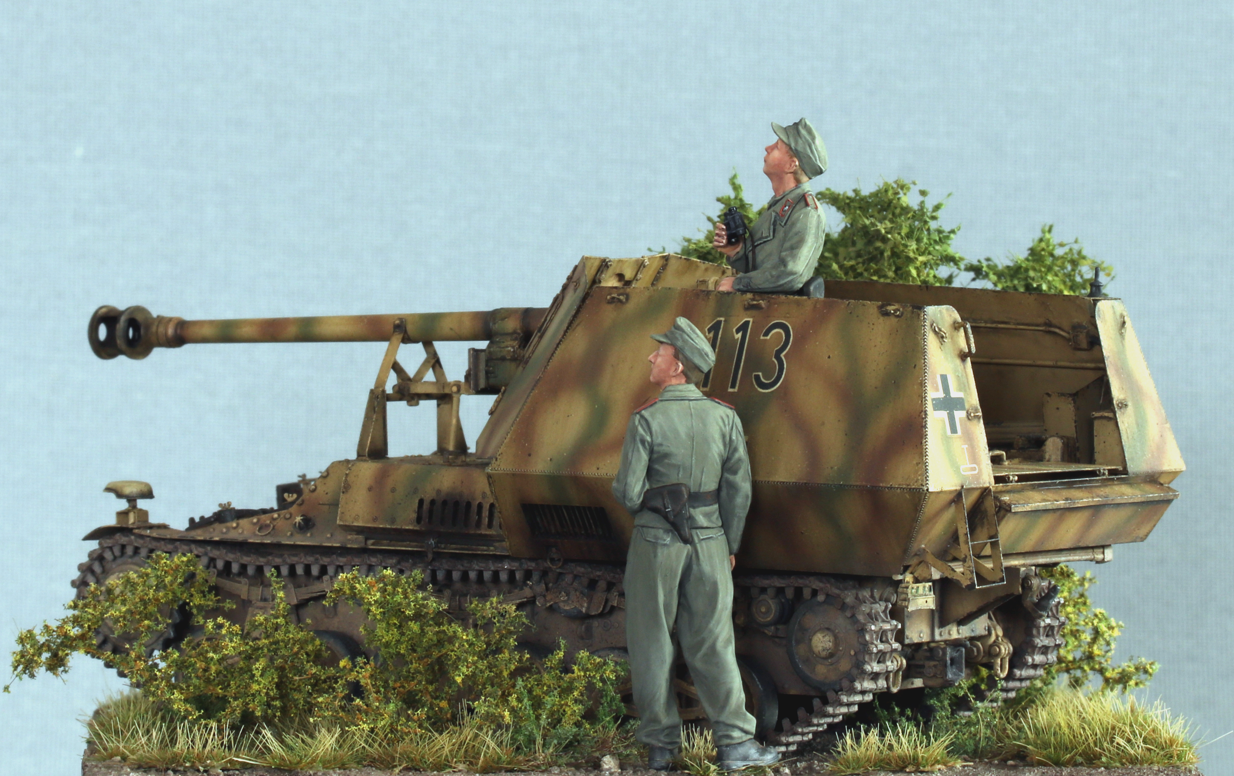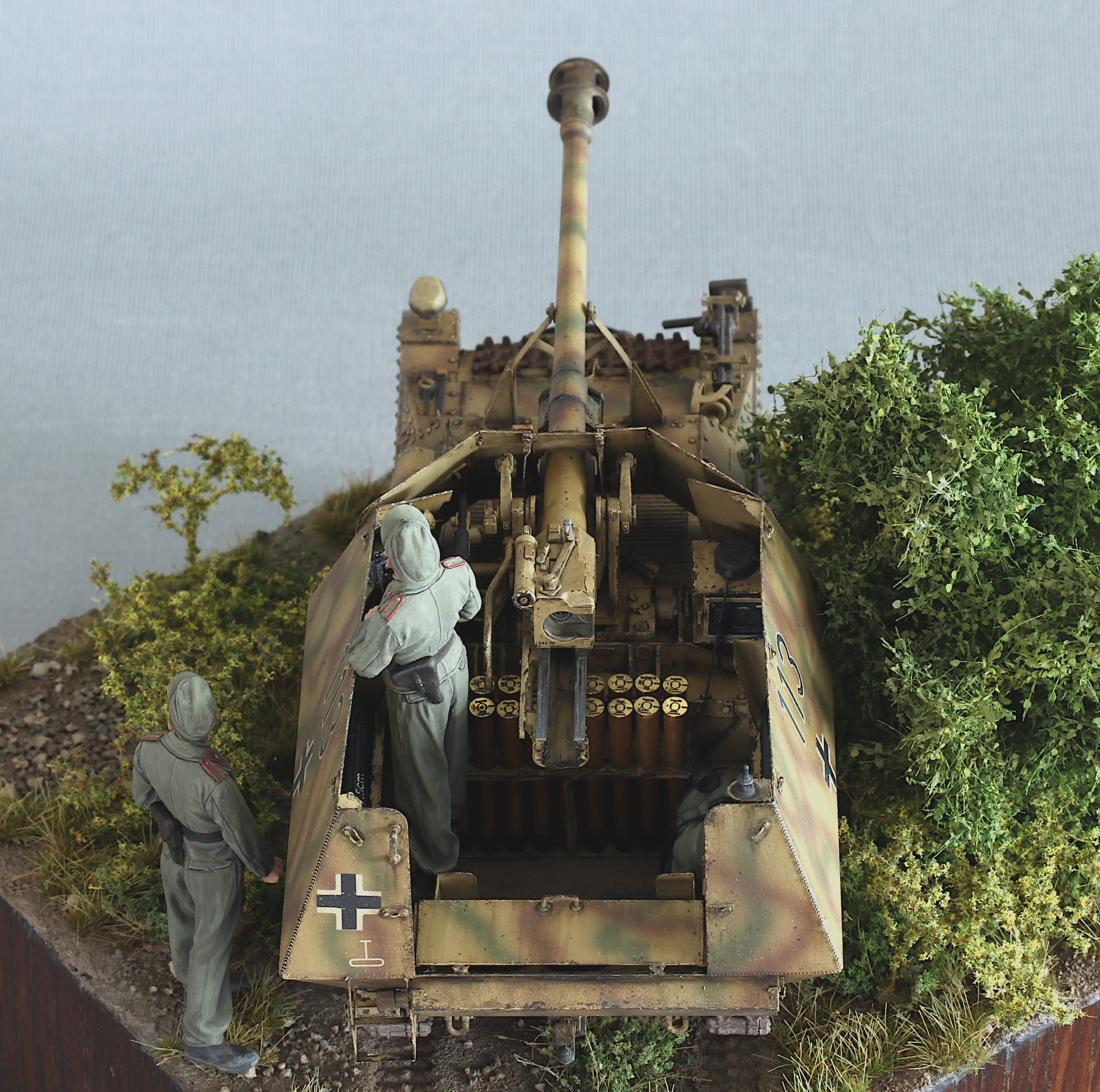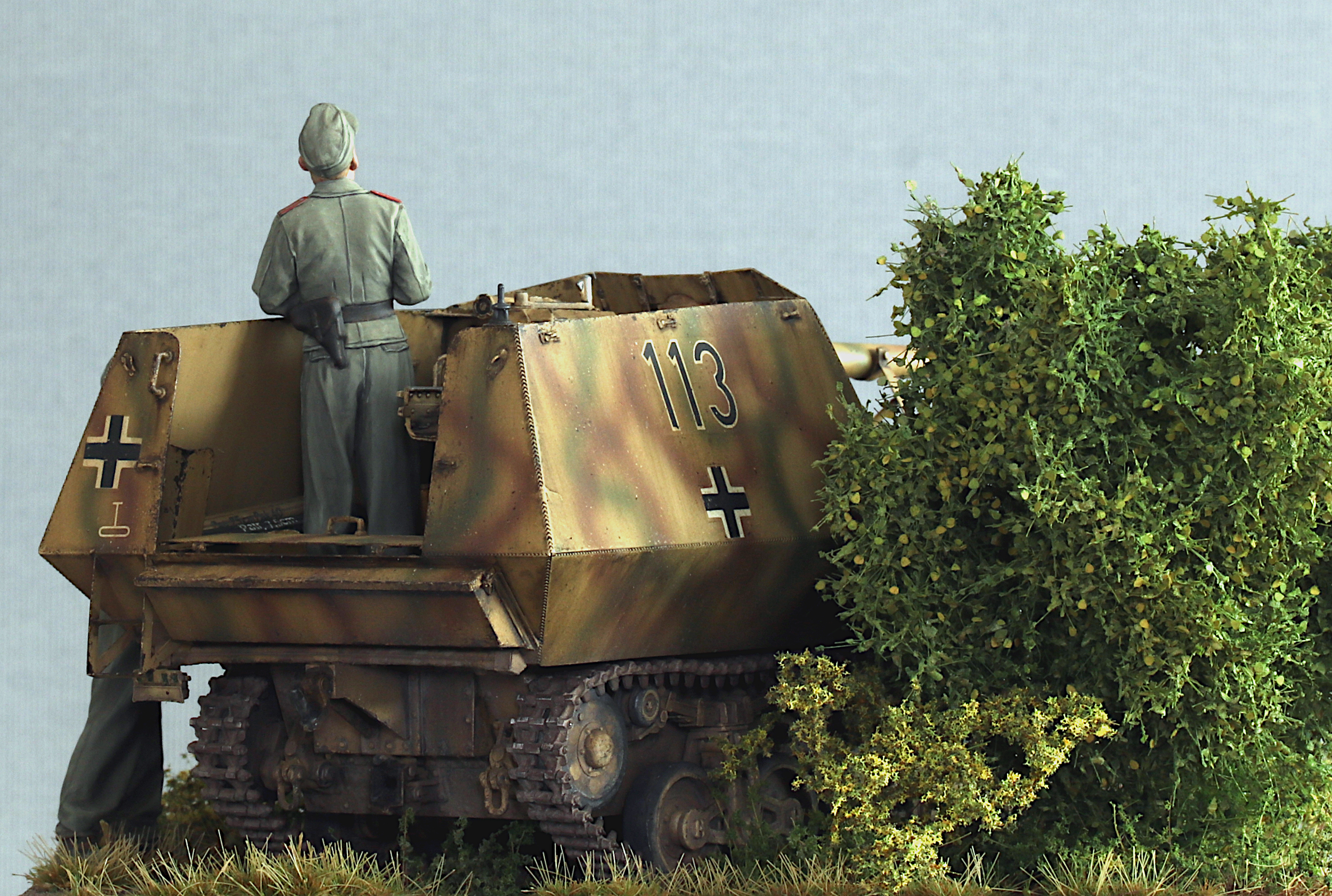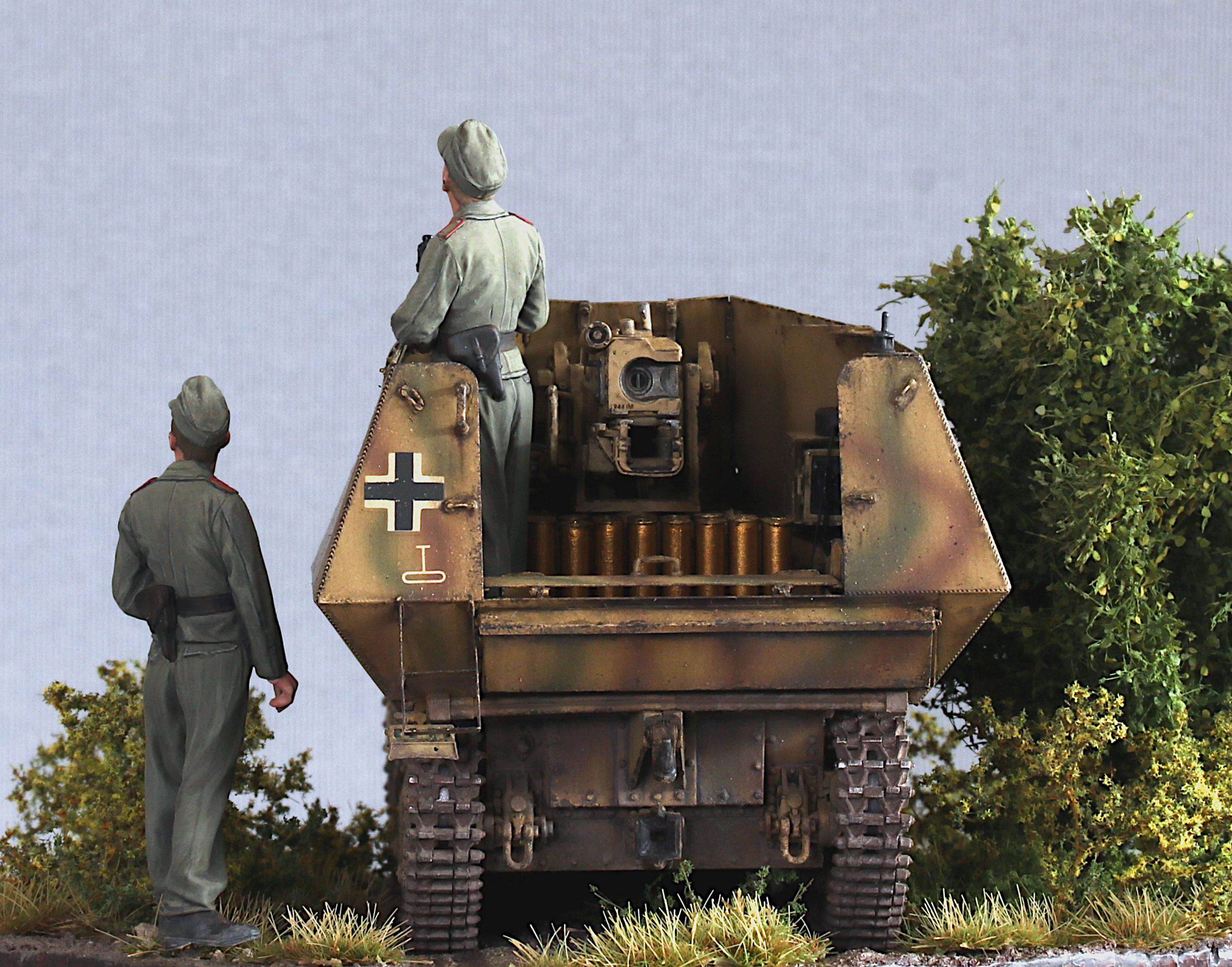 I also added the original Tamiya figures included in the kit. They have very nice poses and very naturally looking folds, but otherwise have very little detail. I was starting to work on resin figures from Royal Model in parallel (the very nicely done Ferdinand crew), which clearly highlighted the differences in detail… but the Tamiya figures are ok.