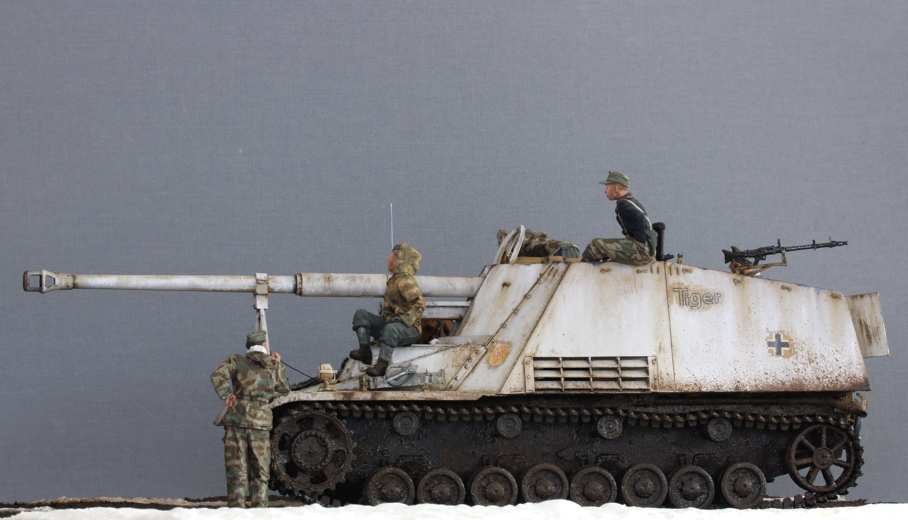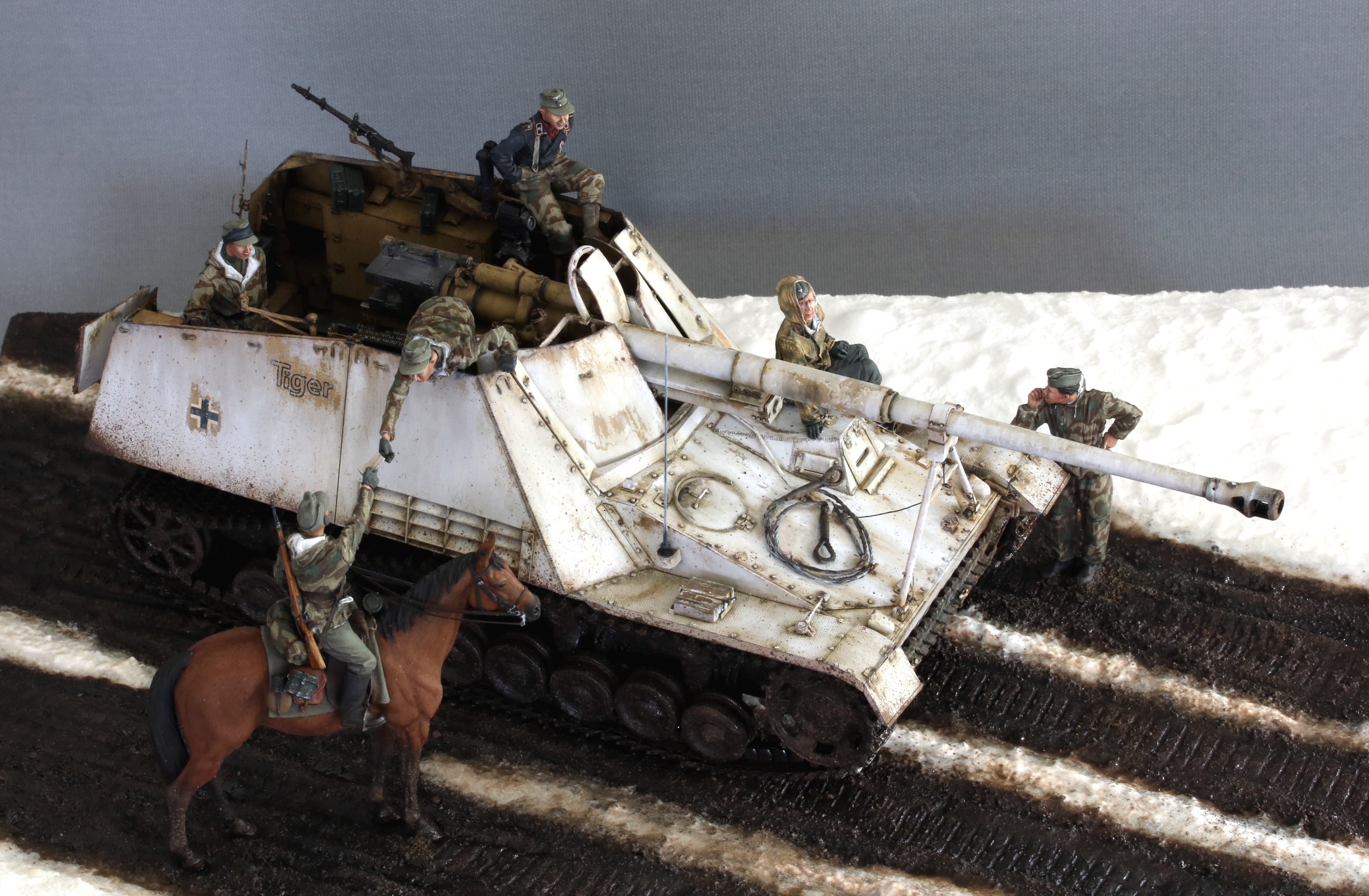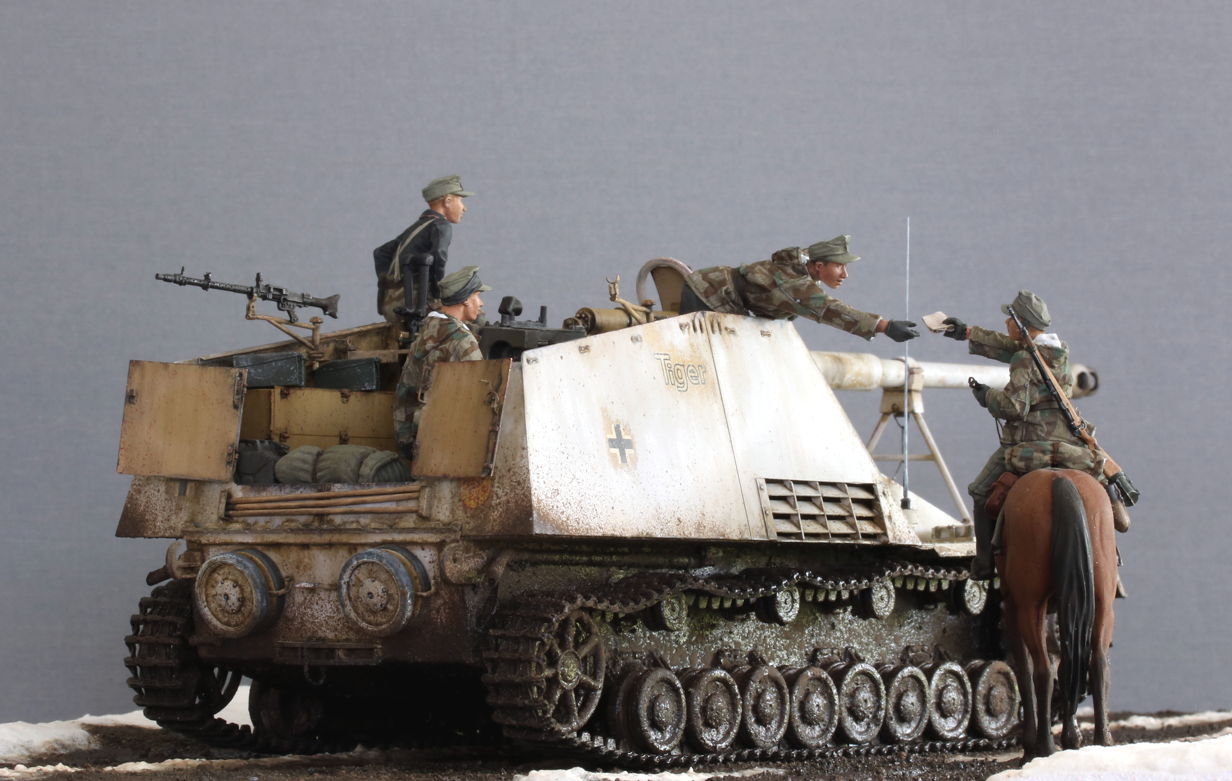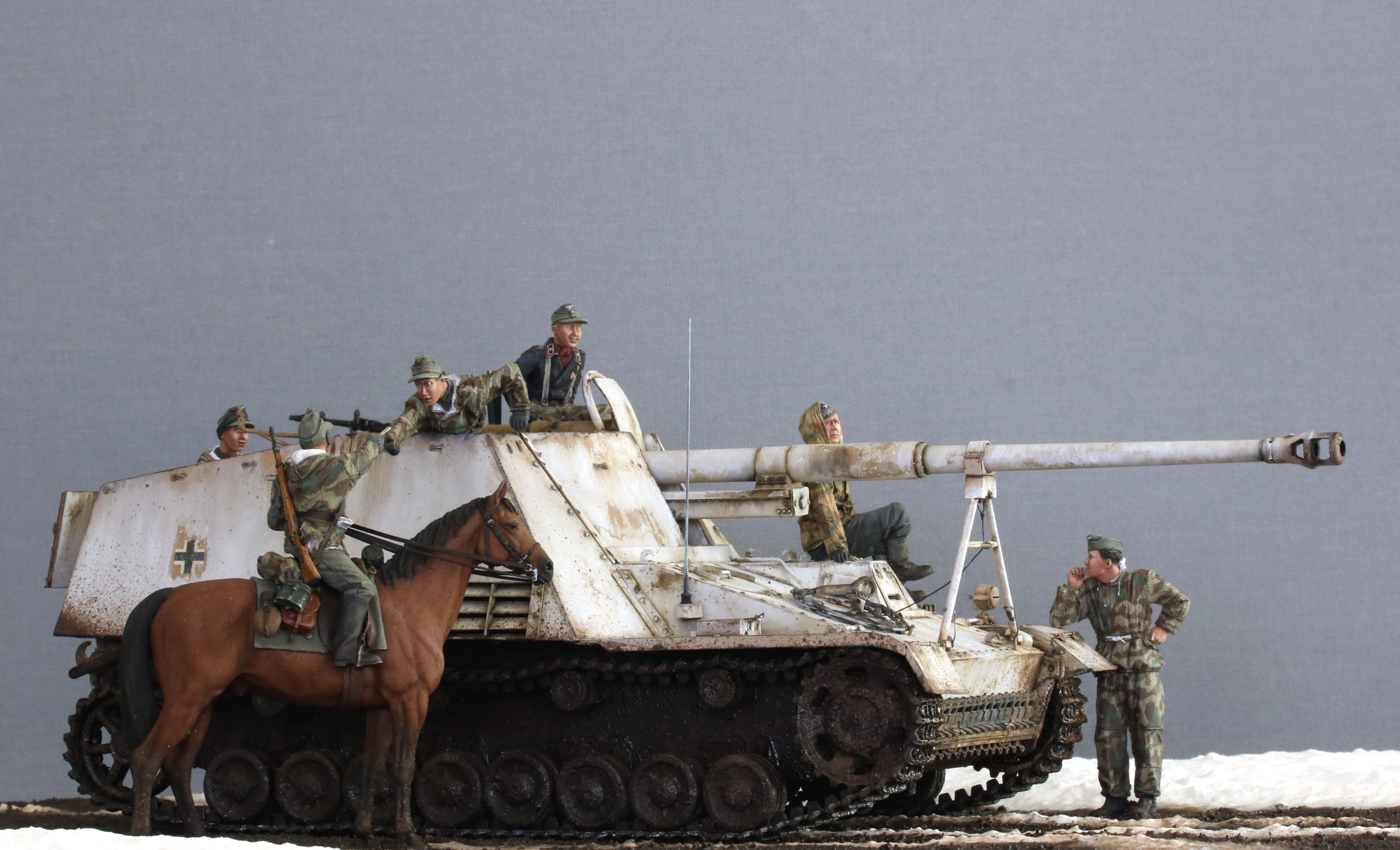 There are numerous pictures of the original vehicle available, and I got inspired by one showing a dispatch rider handing some message to a Nashorn commander. There is actually a figure set available from the Russian manufacturer Stalingrad, featuring six resin figures plus a very nicely crafted horse. As kit I chose the AFV offering, adding a PE set from Voyager models. The idea then was to depict a Nashorn of schwere Panzerjaegerabteilung 519 in winter withewash, located near Vitebsk (Belarus) in January 1944.