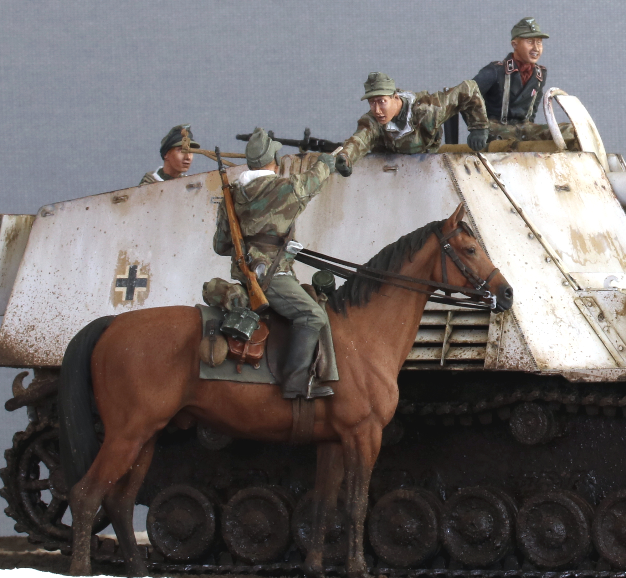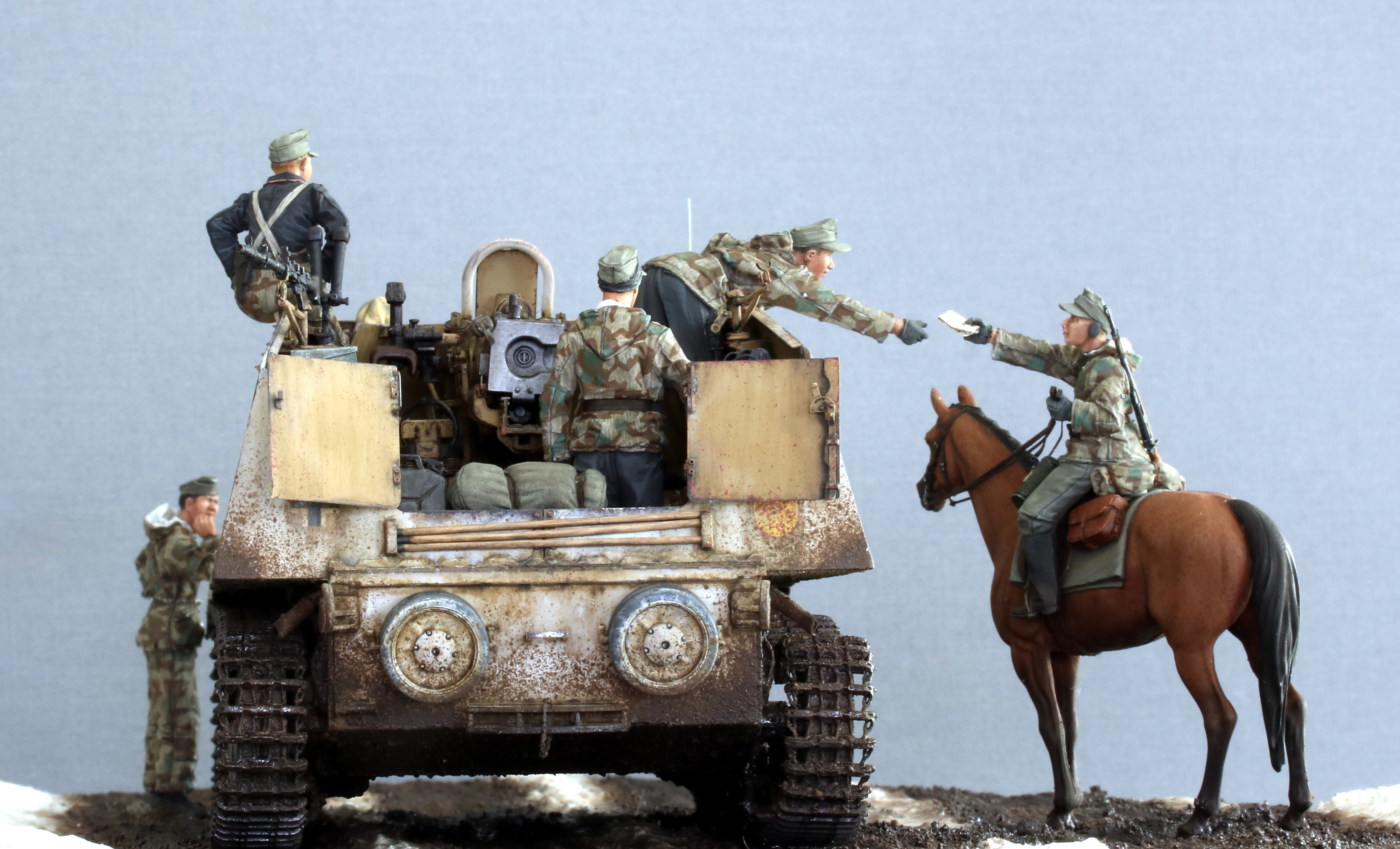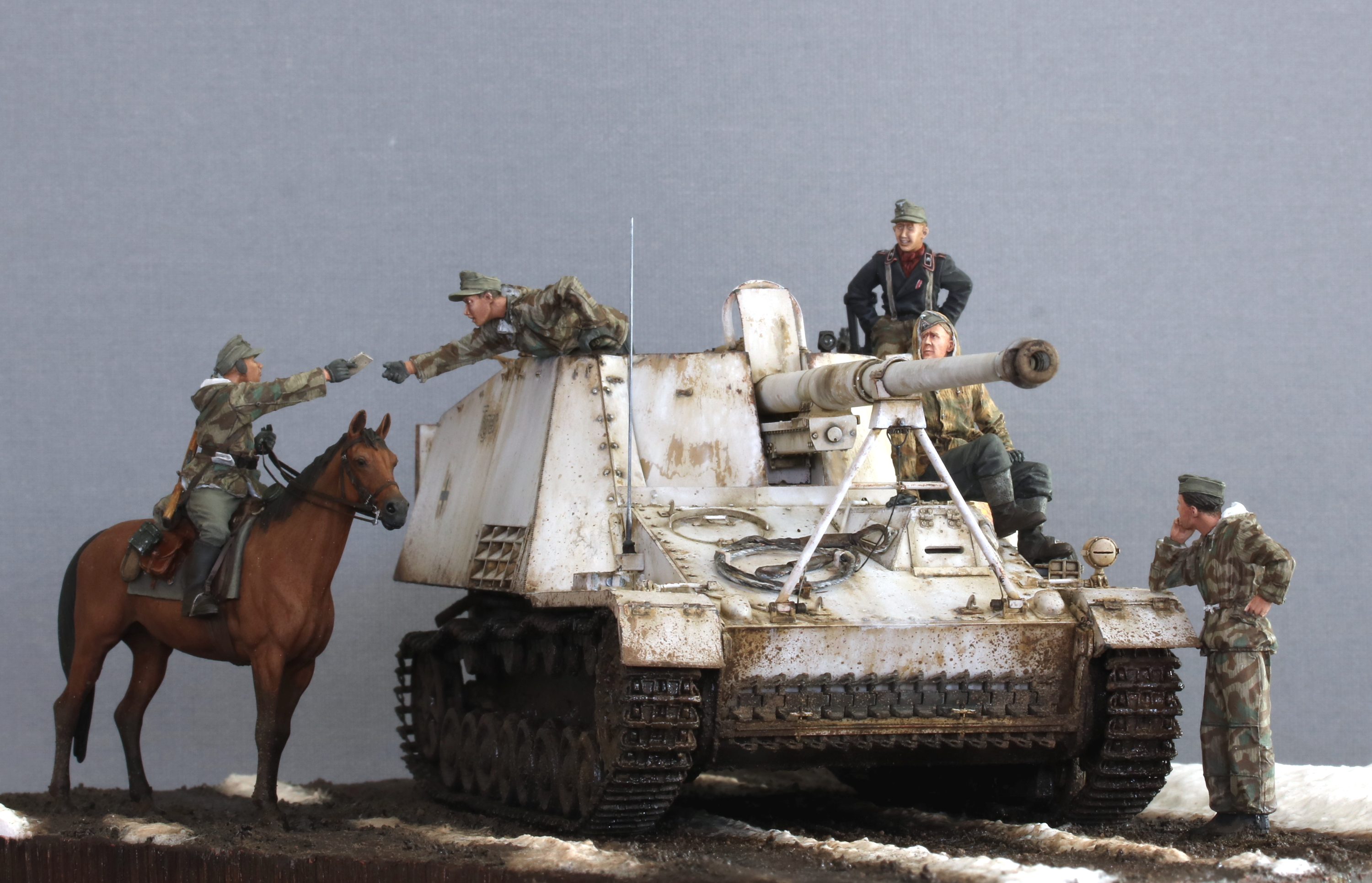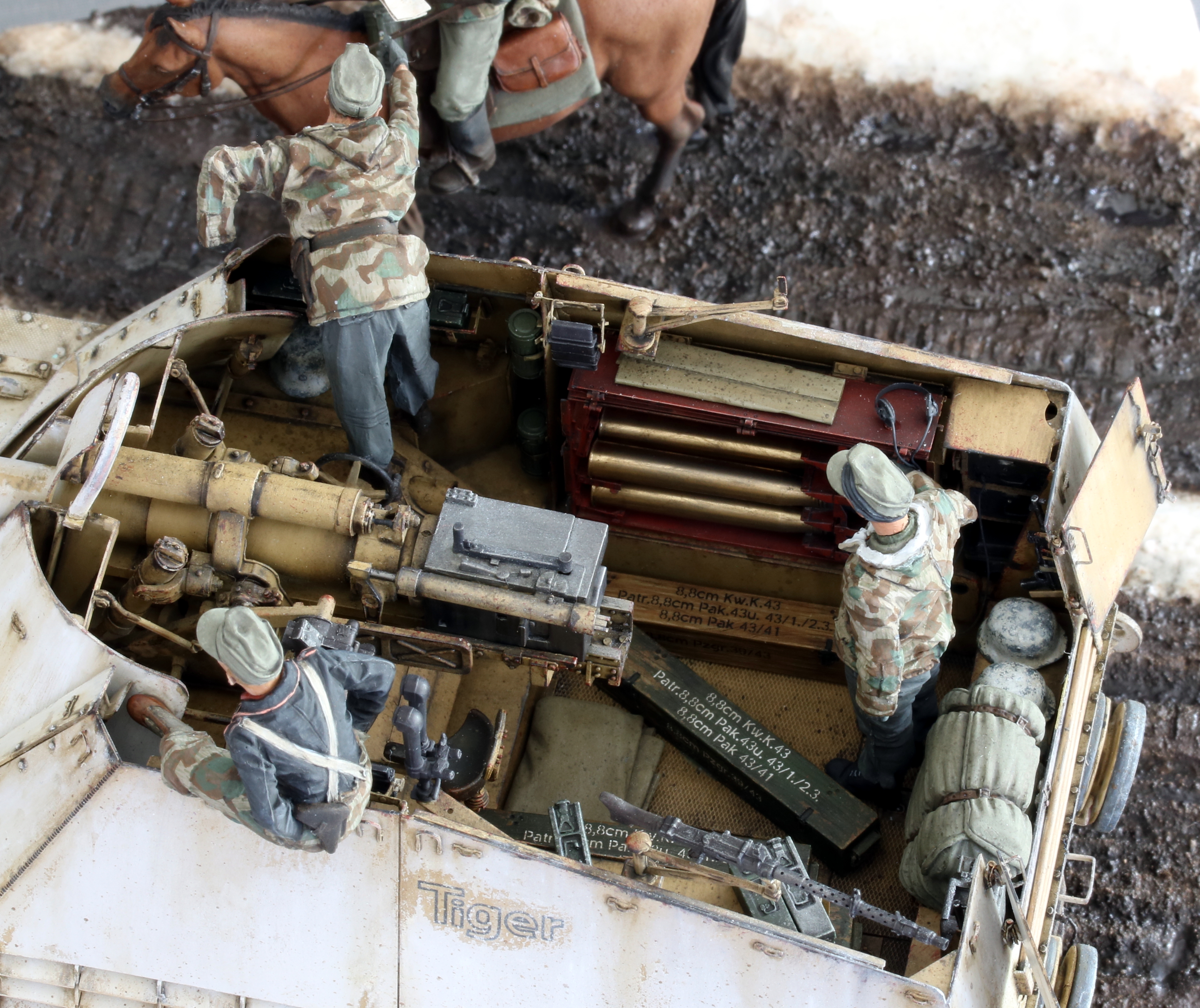 There are numerous pictures of the original vehicle available, and I got inspired by one showing a dispatch rider handing some message to a Nashorn commander. There is actually a figure set available from the Russian manufacturer Stalingrad, featuring six resin figures plus a very nicely crafted horse. As kit I chose the AFV offering, adding a PE set from Voyager models. The idea then was to depict a Nashorn of schwere Panzerjaegerabteilung 519 in winter withewash, located near Vitebsk (Belarus) in January 1944.