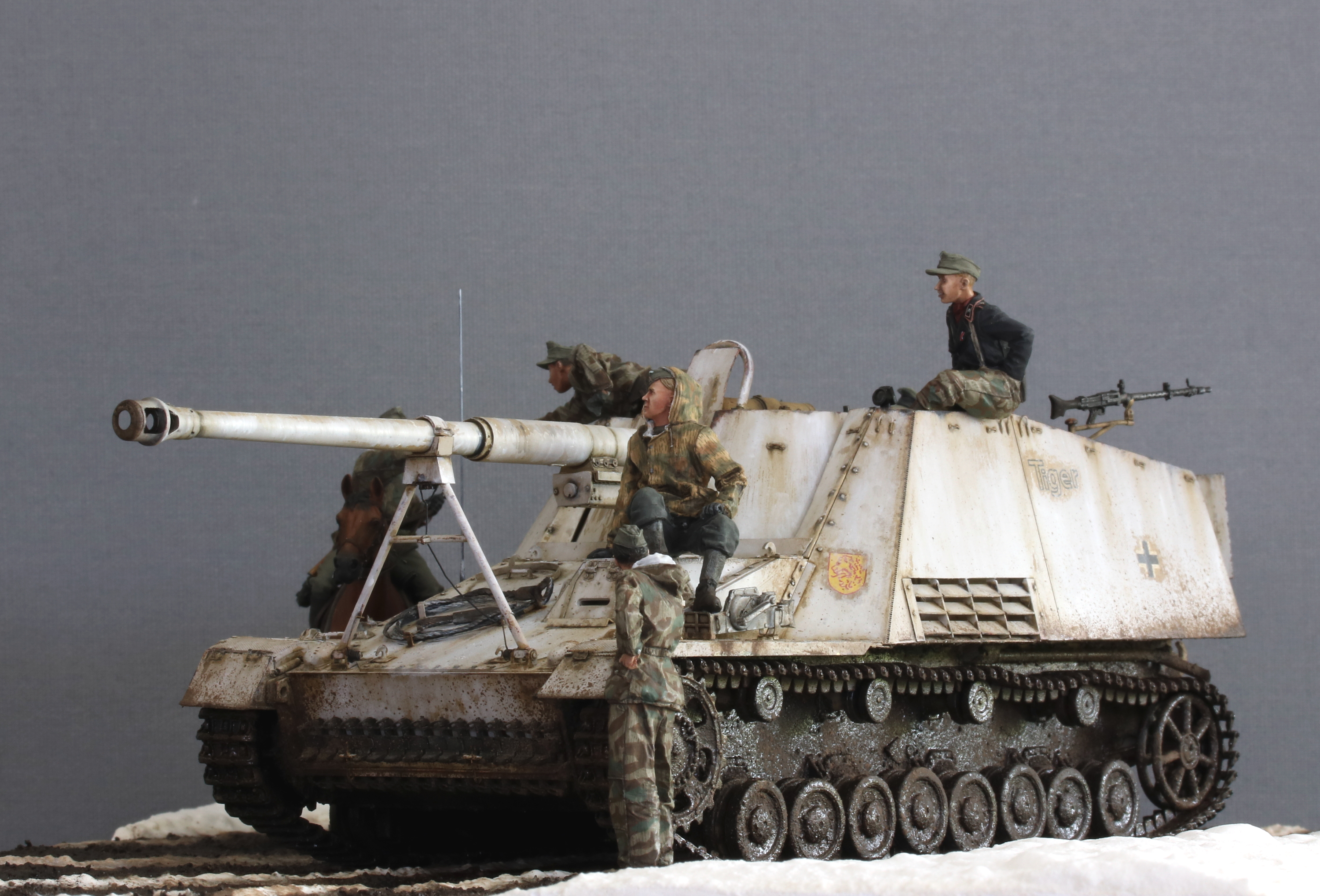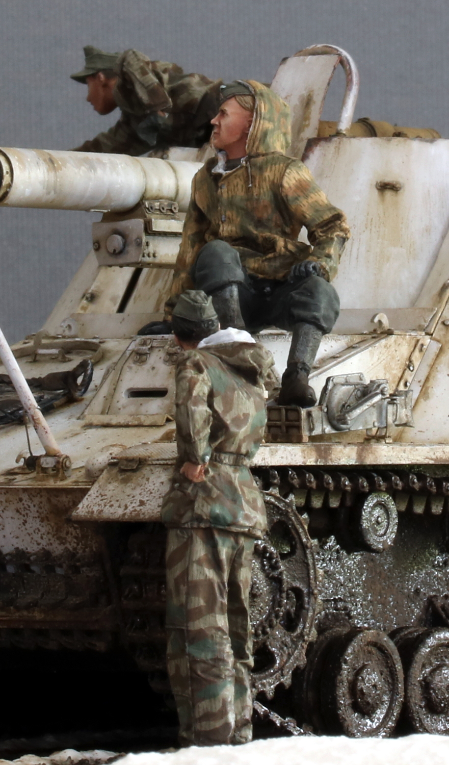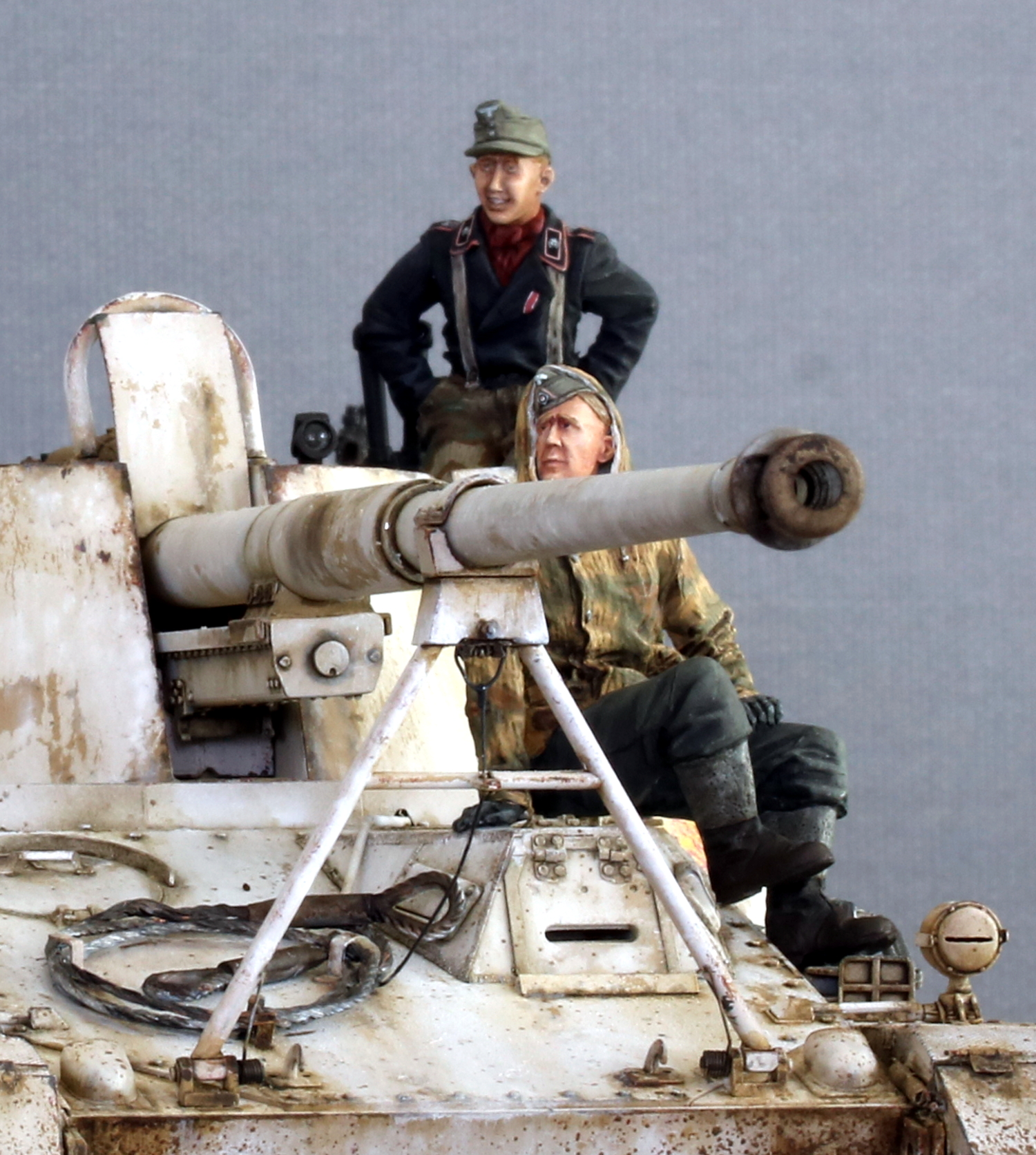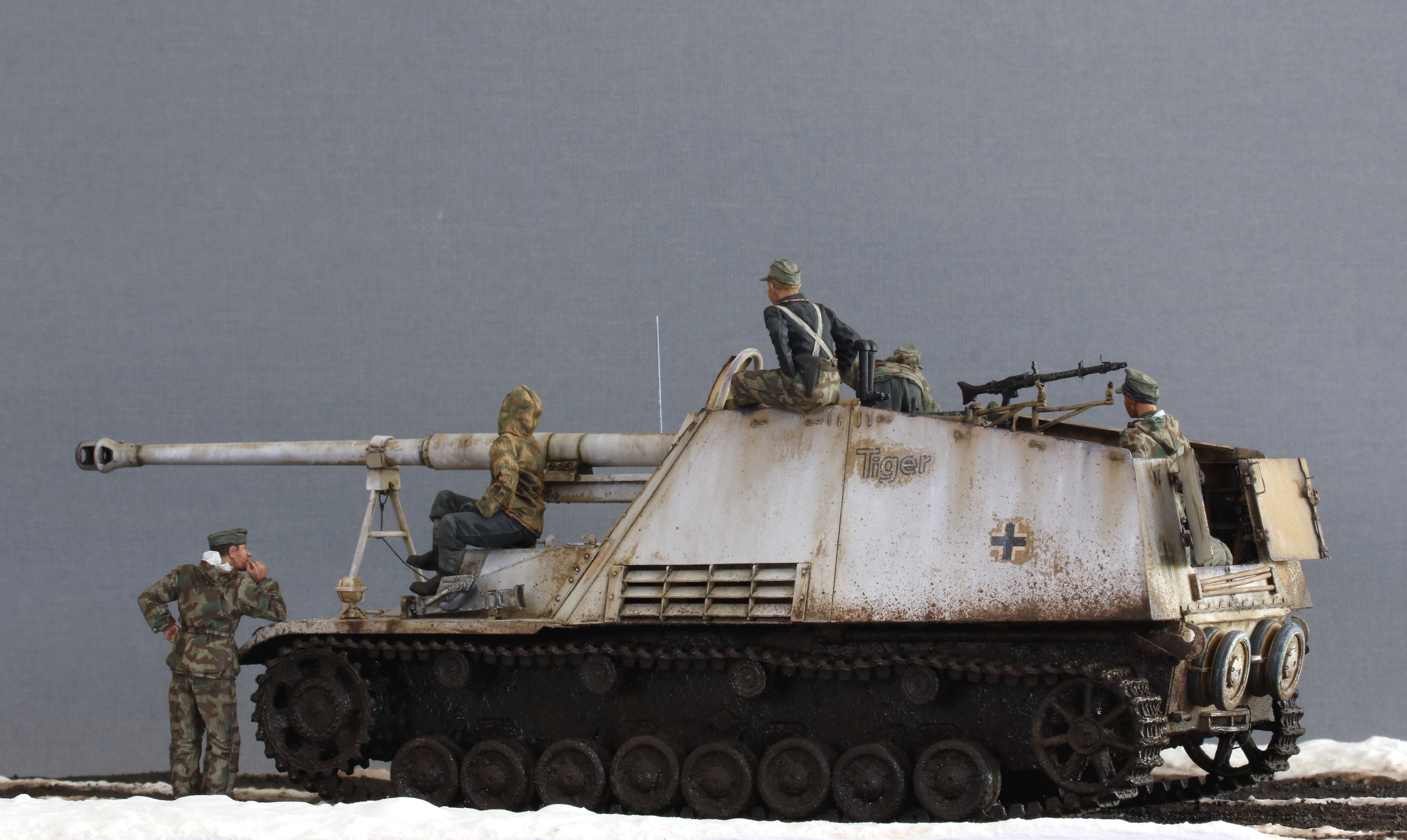 There are numerous pictures of the original vehicle available, and I got inspired by one showing a dispatch rider handing some message to a Nashorn commander. There is actually a figure set available from the Russian manufacturer Stalingrad, featuring six resin figures plus a very nicely crafted horse. As kit I chose the AFV offering, adding a PE set from Voyager models. The idea then was to depict a Nashorn of schwere Panzerjaegerabteilung 519 in winter withewash, located near Vitebsk (Belarus) in January 1944.