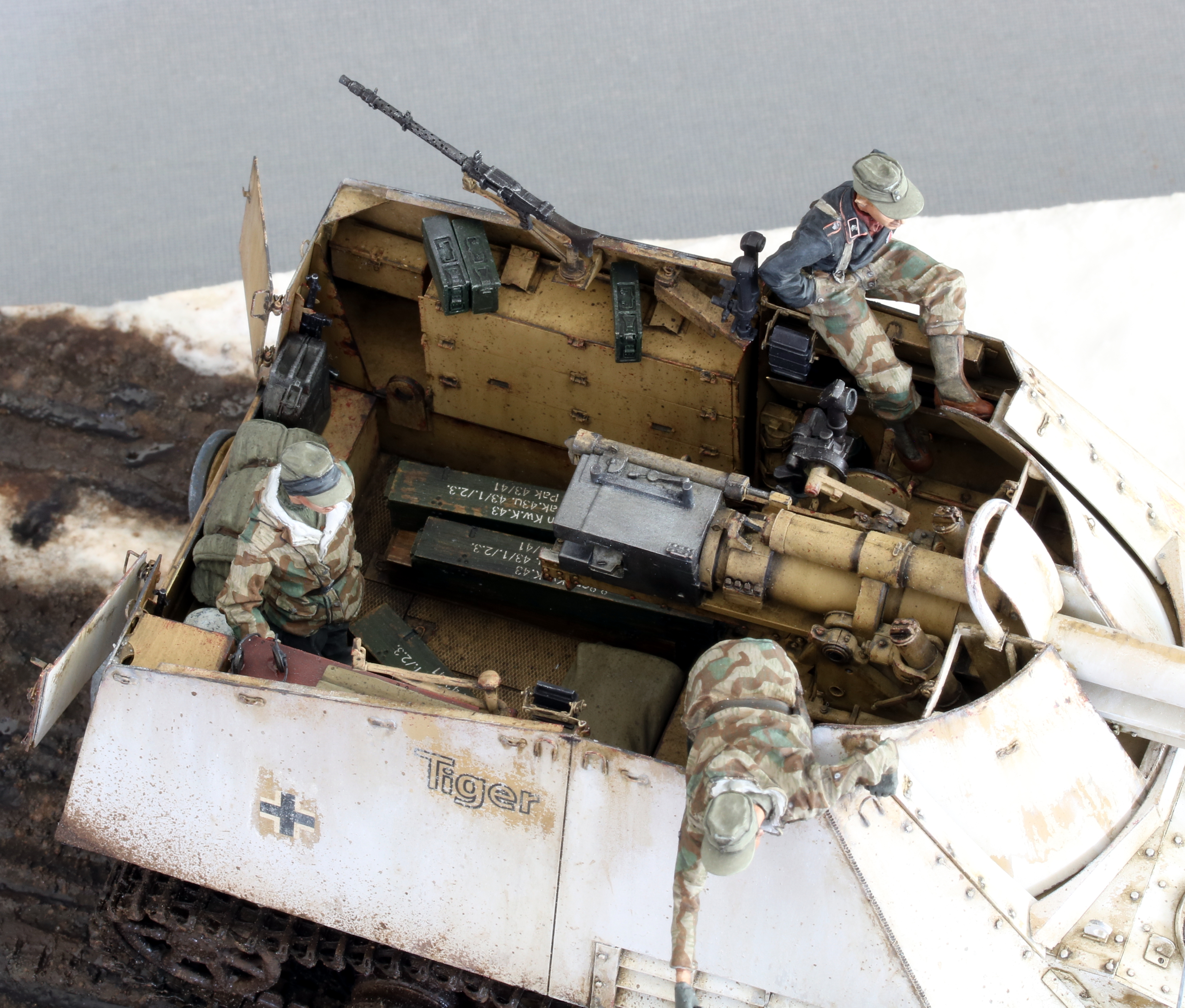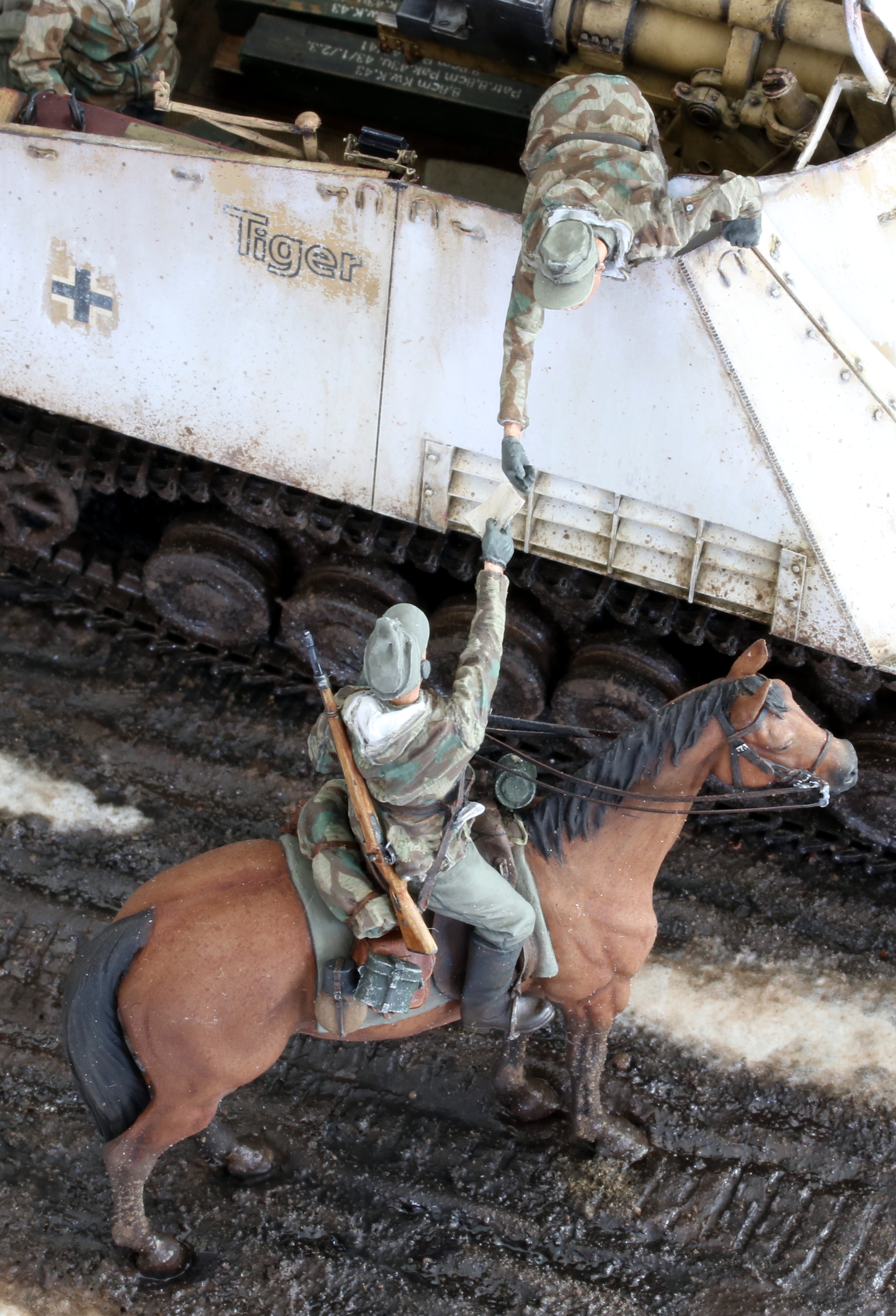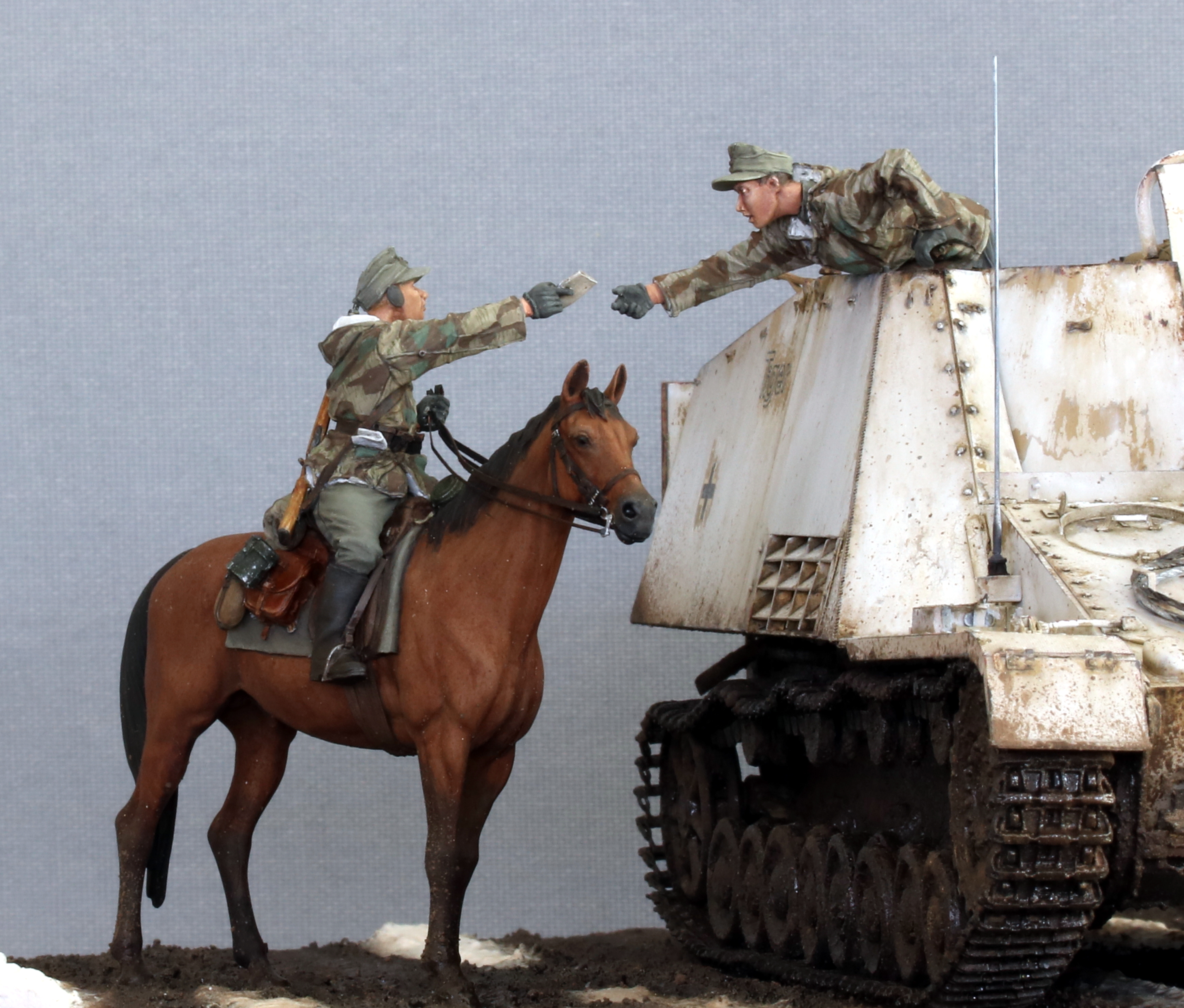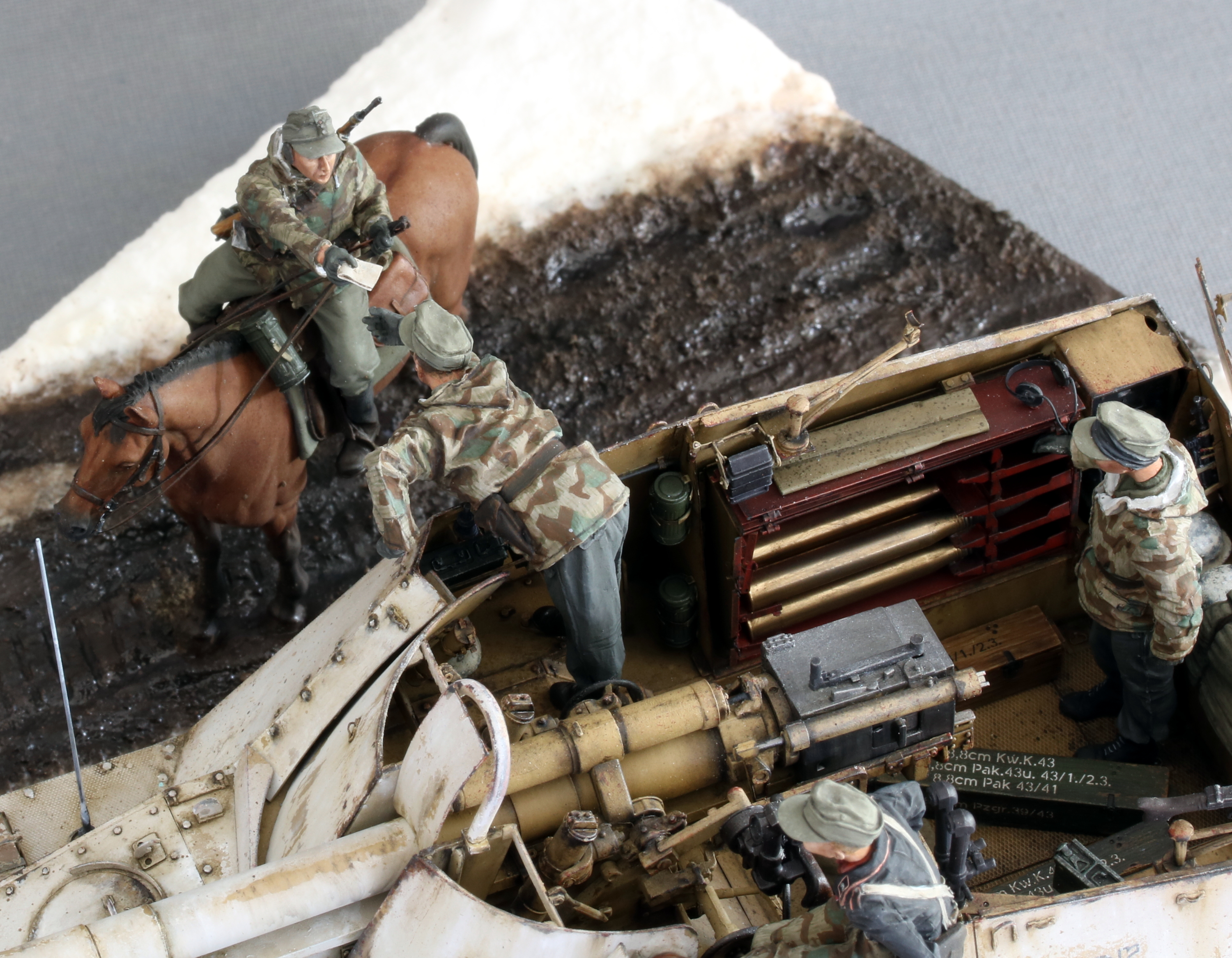 There are numerous pictures of the original vehicle available, and I got inspired by one showing a dispatch rider handing some message to a Nashorn commander. There is actually a figure set available from the Russian manufacturer Stalingrad, featuring six resin figures plus a very nicely crafted horse. As kit I chose the AFV offering, adding a PE set from Voyager models. The idea then was to depict a Nashorn of schwere Panzerjaegerabteilung 519 in winter withewash, located near Vitebsk (Belarus) in January 1944.