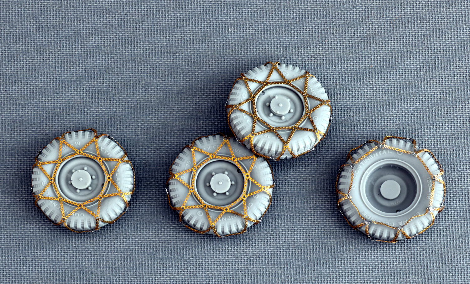 I also fixed snow chains (from Minor, a Spanish company) to the resin wheels I bought separately. Soldering works well, and the joints are soldered together fast enough not to leave any damage on the wheels:
